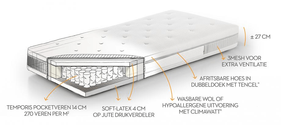 - Exclusieve Temporis Pocketverenkern van 14 cm (270 veren per m2) afgedekt met 4 cm Soft-Latex op jute drukverdeler